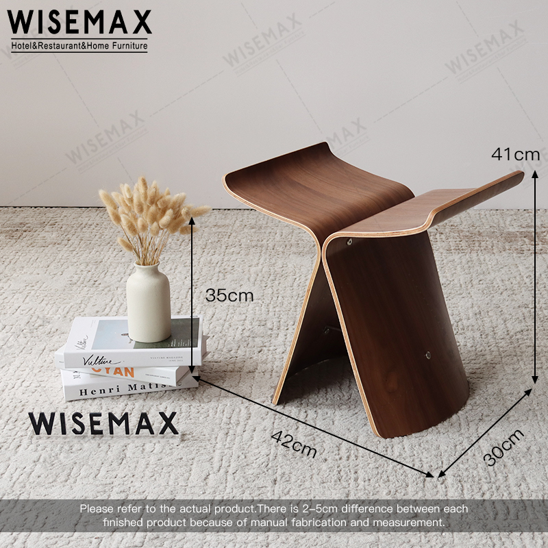The small stool is made of shaped curved wood, which is more stable and sturdy, with clear wood grain texture.The lower part is fixed with metal screws and stainless steel rods to enhance the load-bearing capacity of the stool.