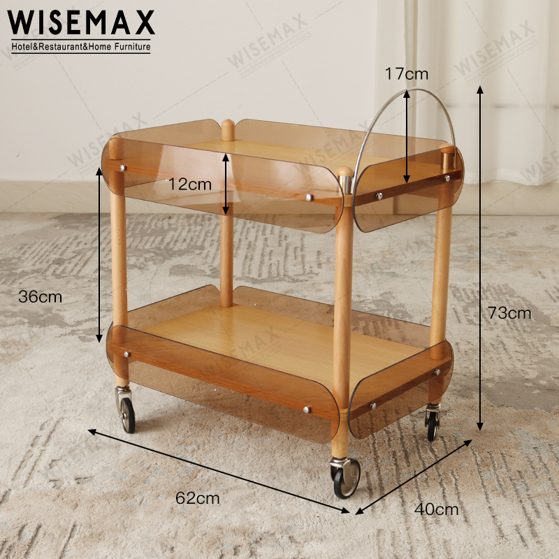 The main frame of the cart is solid wood, and the tabletop is made of plywood. The side is made of high-quality brown acrylic board. Metal arched handle for easy movement. Flat push with lock