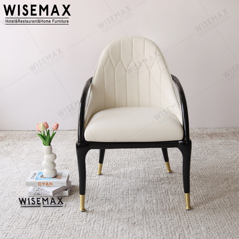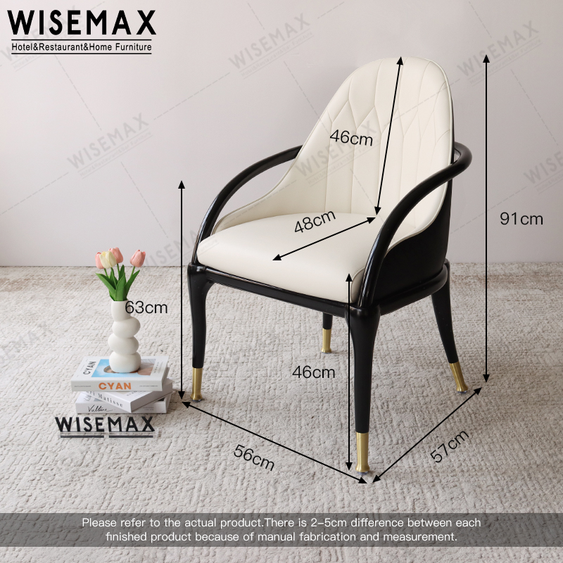 The chair frame is made of solid wood with glossy painting, and the capping is stainless steel.Curved and round backrest and armrest comforts to human body design. The smooth armrest design makes the chair look comfortable and luxurious.