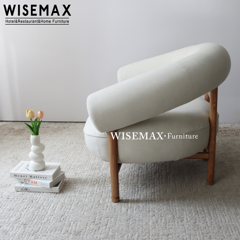 Wraparound backrest with generous padding, offering cozy and supportive comfort.A thickly cushioned seat that provides soft yet resilient support for total relaxation.Wooden legs in a natural finish, ensuring sturdy stability and a light aesthetic.