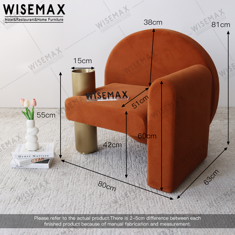 The leisure chair is made of high density sponge upholstery with velvet fabric.There is golden stainless steel round tray on the chair.The chair base is strong and big to ensure the stability of the chair