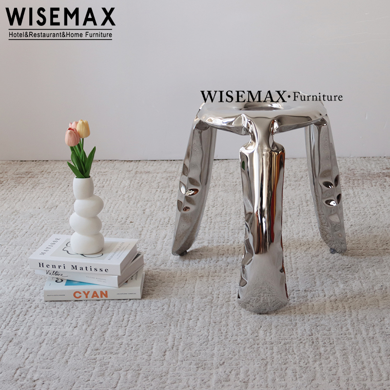 A sculptural stool with a gleaming silver finish and organic curves becomes the modern centerpiece.Stool blends artistry and function. Its fluid seat and three-legged base stand gracefully against textured carpet, complemented by greenery and colorful accents for a calming yet dynamic vibe.Designed for hotel, restaurant, or home use, this stool balances minimalism and warmth.