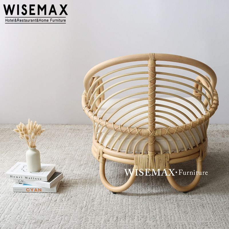 The curved rattan wraps around the back, its delicate curves naturally conforming to the back, creating a natural, breathing curve.The off-white fabric cushion is thick and fluffy, gently inviting you to sink in and embrace any posture.The four slender yet sturdy rattan legs gently touch the ground in a slight arc, making the chair appear to float in the light and shadow.