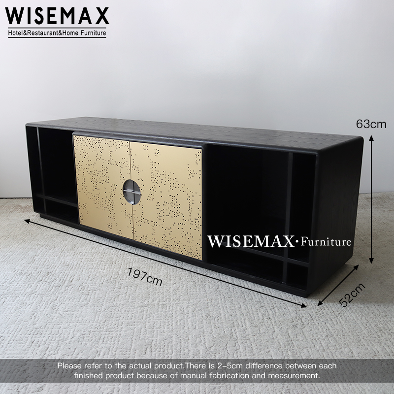 The black cabinet surface is calm and neat, the golden double doors are decorated with star-shaped hollow patterns.The combination of open storage compartments on both sides and a central golden door, without traditional drawer design, allows for both display and hidden storage.Solid wood frame is stable and durable.