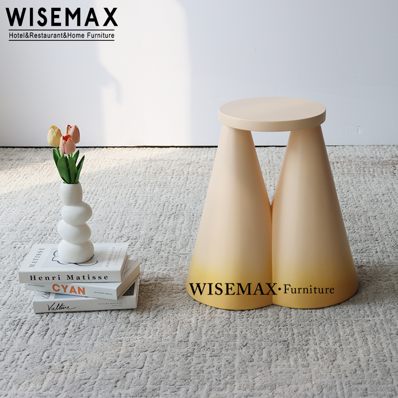 A perfectly round and smooth tabletop offers a minimalist canvas for your decor. Its flat, elegant surface is both functional and stylish, ready to hold a book or a decorative vase.Artfully crafted cone-shaped legs feature a soft gradient finish, fading from peach to yellow.Inspired by artistic fluidity, this unique stool blends form and function.