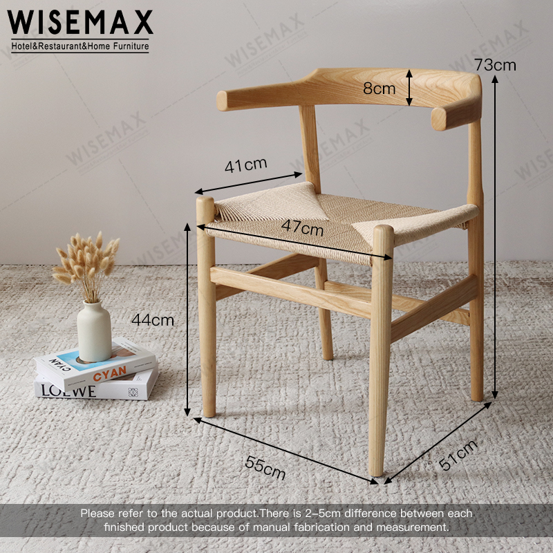 The dining chair frame is made of solid ash wood in natural color.Half round backrest design brings good support to back and arm.The seat is made of good quality rope in careful woven to be neat.
