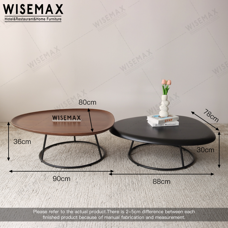 The coffee table is oversize design, the top can be about L90 or L80cm.The table top is made of solid walnut wood, it's concave-convex design.The base is round solid metal base to ensure the table to be stable and sturdy.