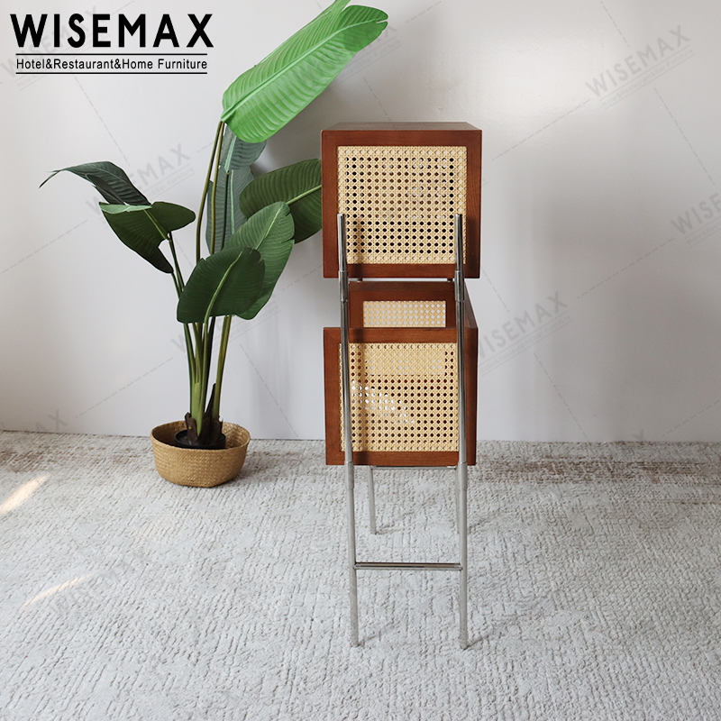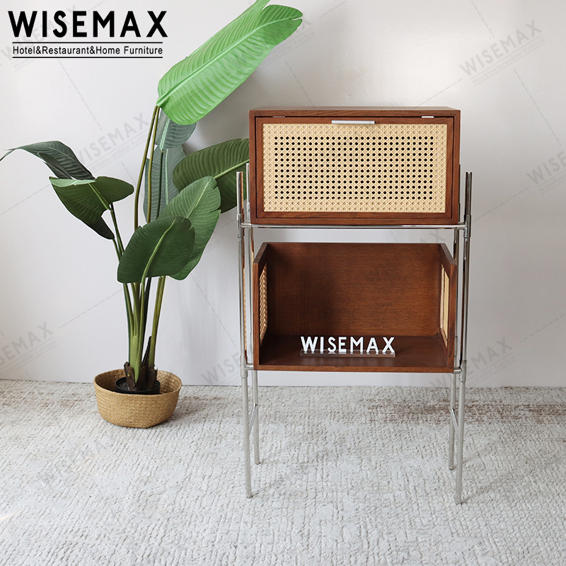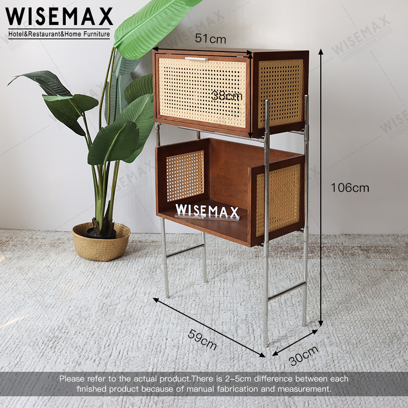 The storage cabinet consists of two storage spaces and is made of solid wood and rattan.The cabinet door has a pull-down design, which is refreshing and breathable.The locker frame is made of metal and is strong and durable.