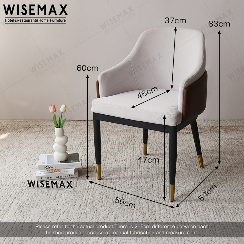 The dining chair seat is high density sponge upholstery fabric.The side armrest and back of the chair is leather, the color is optional.The chair legs can be solid ash wood or carbon stel base, it's strong and stable