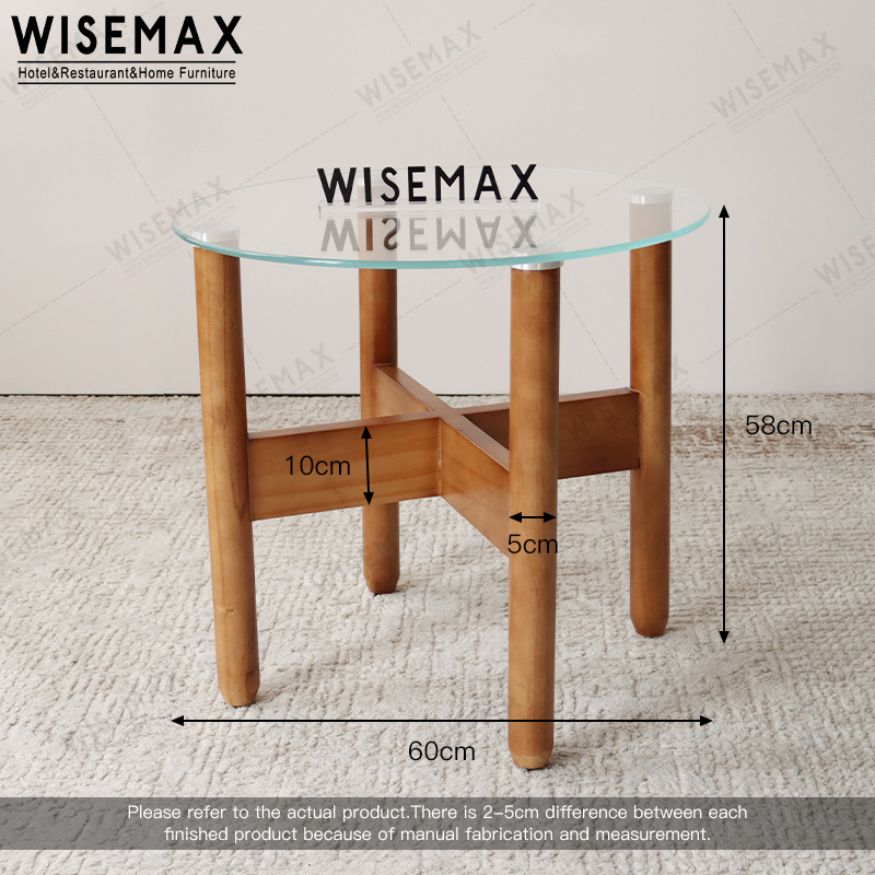 The side table top is made of tempered glass material, which is transparent and easy to clean.The table top is flat and round in careful treatment..The base of the side table is made of solid wood, which is strong and stable.