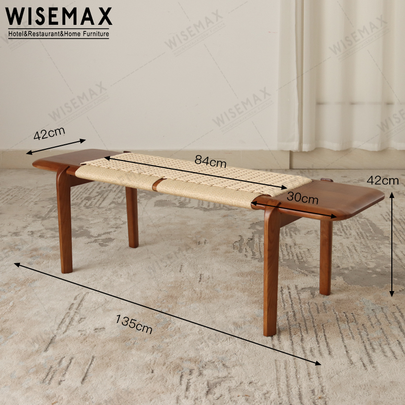 The chair frame is made of walnut wood. This seat is made of hand woven rope. The overall size of the bench is 135 * 42 * 42cm.The MOQ for the bench chair is 1pc only, it's suitable for living room or bedroom.