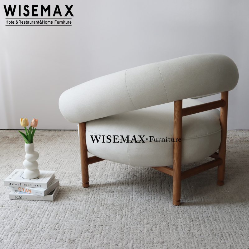 Wraparound backrest with generous padding, offering cozy and supportive comfort.A thickly cushioned seat that provides soft yet resilient support for total relaxation.Wooden legs in a natural finish, ensuring sturdy stability and a light aesthetic.