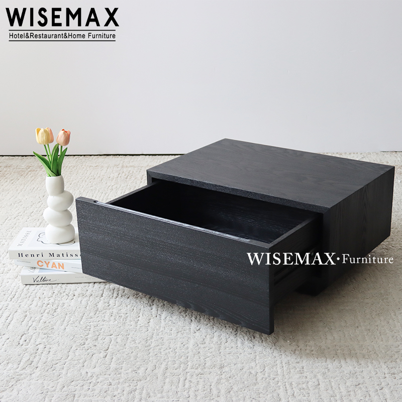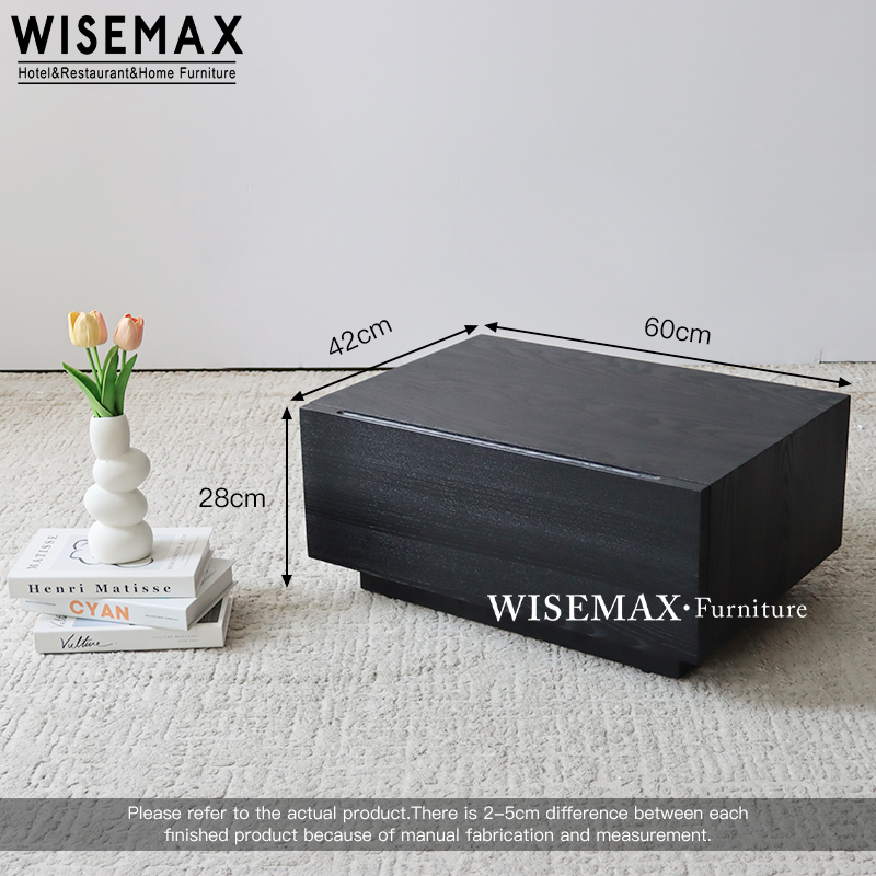 Sleek black matte finish with a subtle wood grain, elegantly outlined by a thin silver line on the front edge.The drawer appears as a single, seamless panel, with its subtle wood grain continuing flawlessly from the top surface.A low, solid base that sits flush to the floor, providing a stable and grounded appearance.