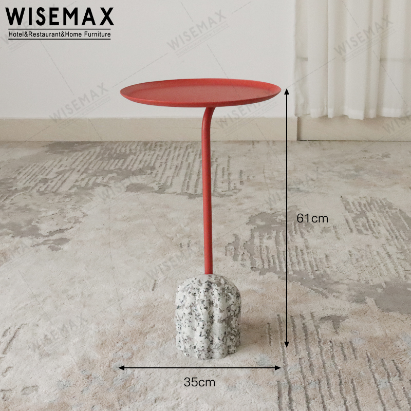 The coffee table on the side is made of red coated metal. The base of the table is made of natural stone. It is suitable for sofa side tables or bed end tables.