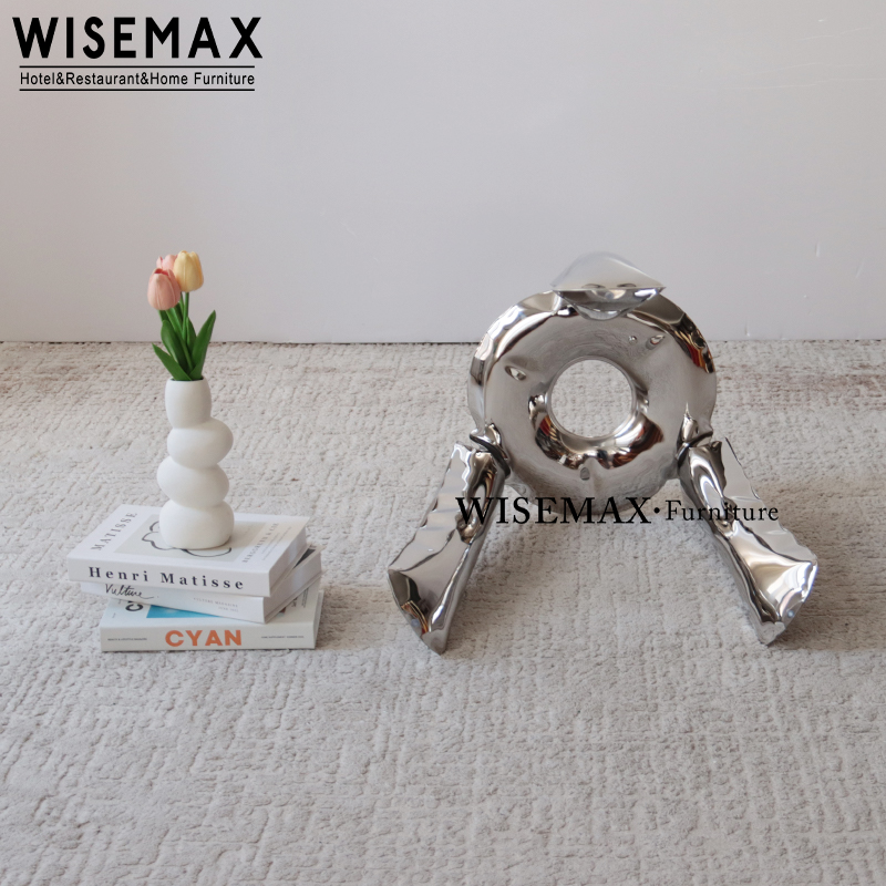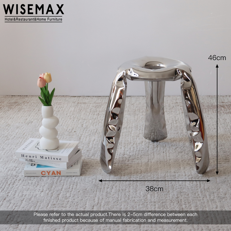 A sculptural stool with a gleaming silver finish and organic curves becomes the modern centerpiece.Stool blends artistry and function. Its fluid seat and three-legged base stand gracefully against textured carpet, complemented by greenery and colorful accents for a calming yet dynamic vibe.Designed for hotel, restaurant, or home use, this stool balances minimalism and warmth.