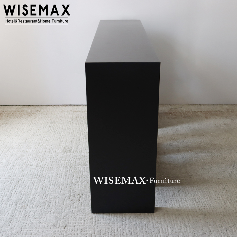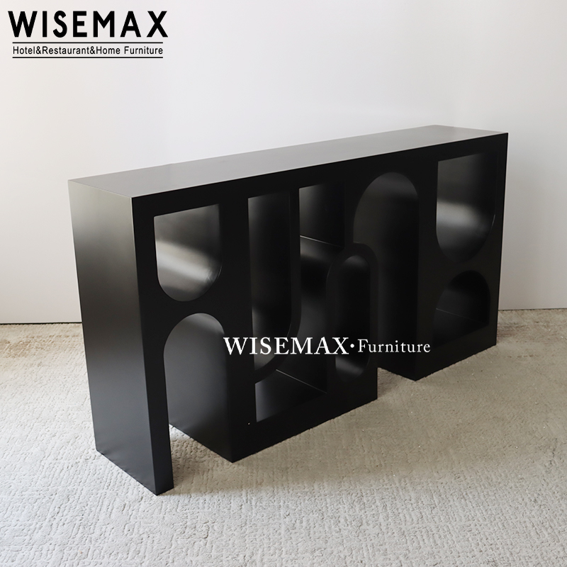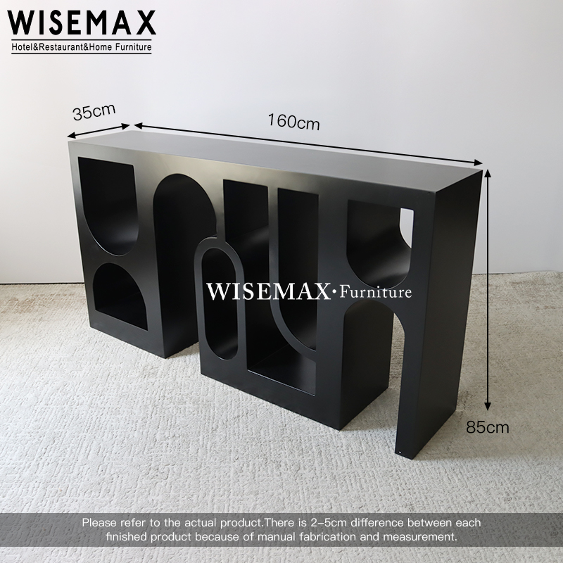 The console table features a sleek black top elevated by four distinct geometric legs with artistic cut-outs.Designed with unique asymmetrical legs and a minimalist profile, this console table brings gallery-like sophistication to hotels and homes.The geometric leg is sturdy and stable.