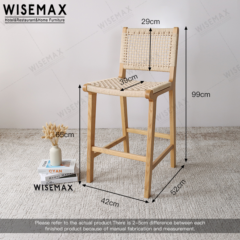 The bar chair seat is made of woven rope,it's neat and clear.The chair frame is made of solid ash wood in natural color.The solid wood base structure is thick enough for being more stable.