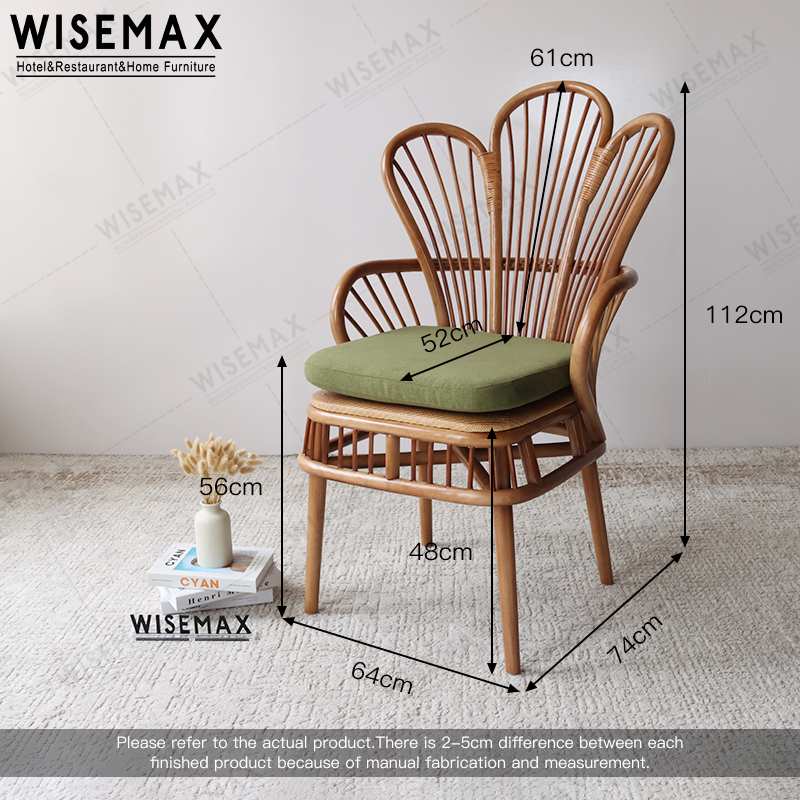 The petal-shaped backrest fits the curves of the human body, making it beautiful and comfortable.The whole chair is made of wood and natural rattan with linen fabric cushion seat.