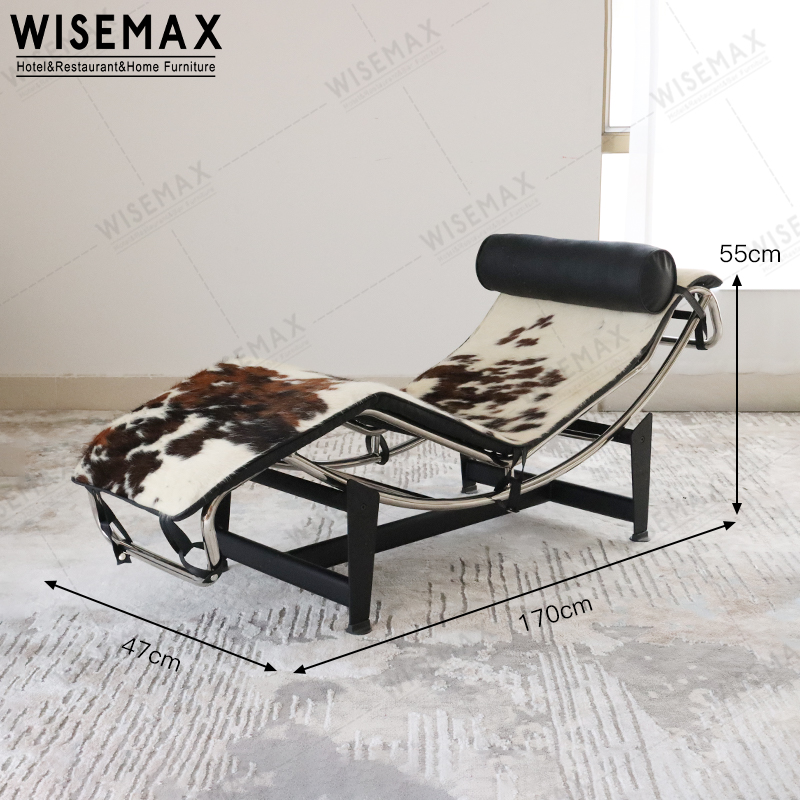 Chaise longue with cover upholstered in a choice of leather or hide, with a leather head roll. Elastic belts or nickel-plated steel springs to fasten the cover. Frame in chrome polished or lacquered black finish.