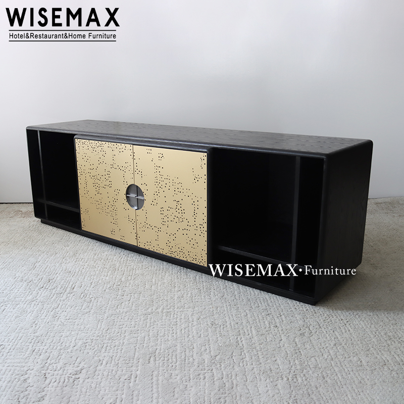 The black cabinet surface is calm and neat, the golden double doors are decorated with star-shaped hollow patterns.The combination of open storage compartments on both sides and a central golden door, without traditional drawer design, allows for both display and hidden storage.Solid wood frame is stable and durable.