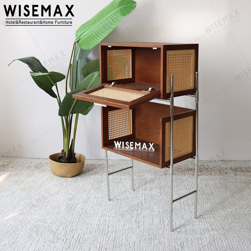RETRO SOLID WOOD AND RATTAN LIVING ROOM SIDE CABINET MAGAZINE DECOR SHELVING