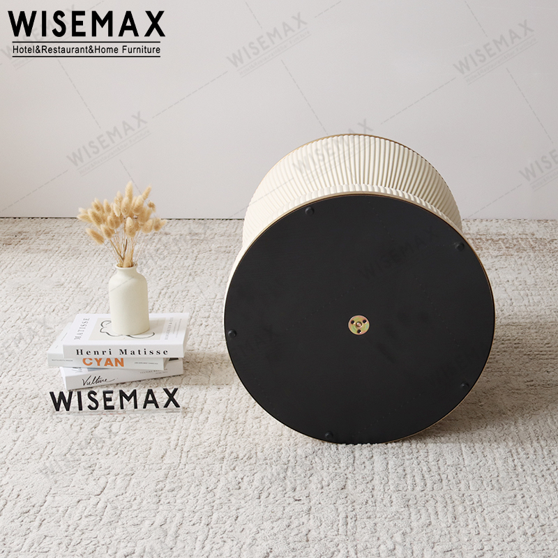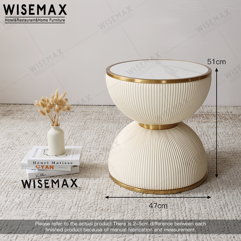The top of the side coffee table is white sintered stone. The table surround is in champagne gold stainless steel. The table edges are in cream sponge upholstered microfiber leather.